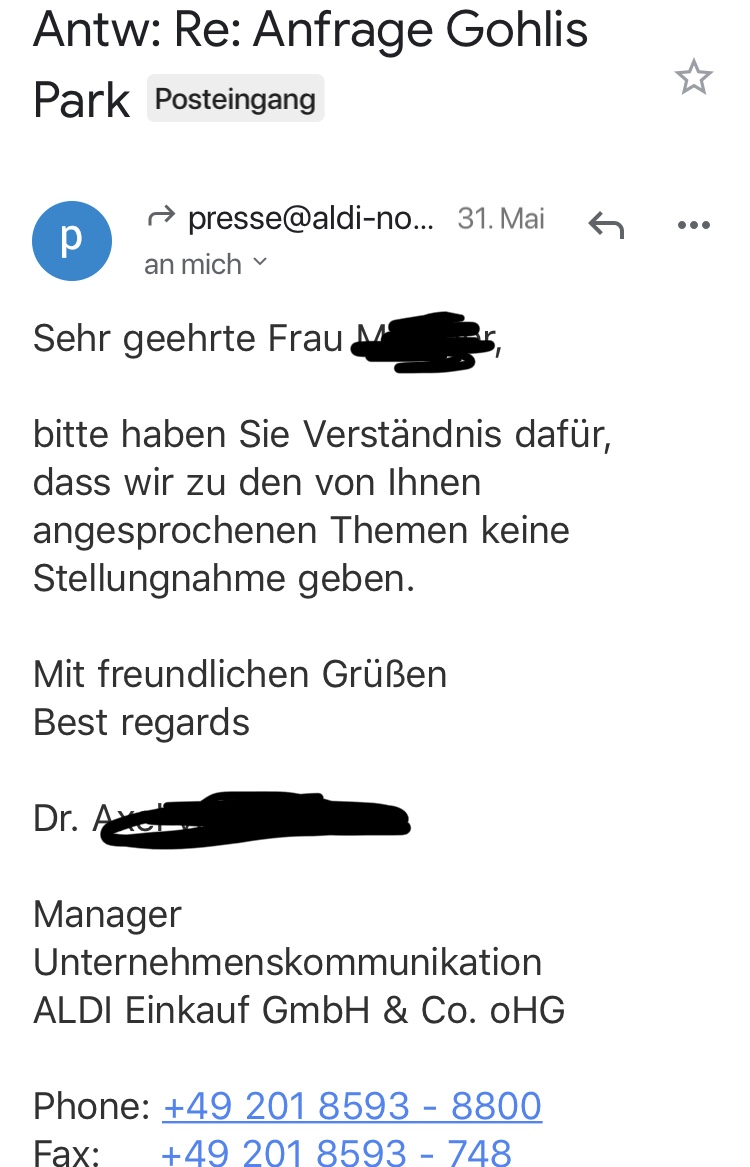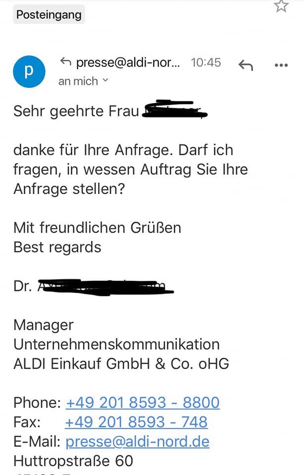 Die erste Rückmeldung erhielten wir von der Pressestelle von ALDI.