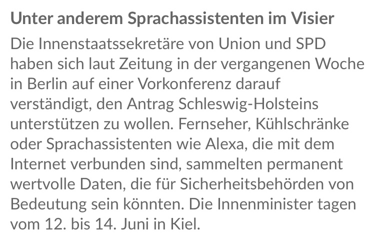 Wie schnell man allerdings in einem totalen Überwachungsstaat zum Systemfeind oder gar Terroristen erklärt werden könnte, wird dabei nicht bedacht. Geschweige denn, dass man es als angenehm empfinden könnte, permanent Zuhörer dabei zu haben.