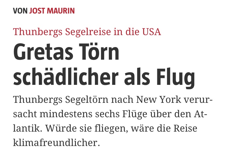 „Natürlich fliegen die da rüber, geht ja gar nicht anders“, so Kling. Herrmann werde für die Rückreise ebenfalls das Flugzeug nehmen. Der Segeltörn löst also mindestens sechs klimaschädliche Flugreisen über den Atlantik aus. Wäre Thunberg gemeinsam mit ihrem Vater geflogen, wären nur zwei nötig gewesen, um nach New York zu kommen.“