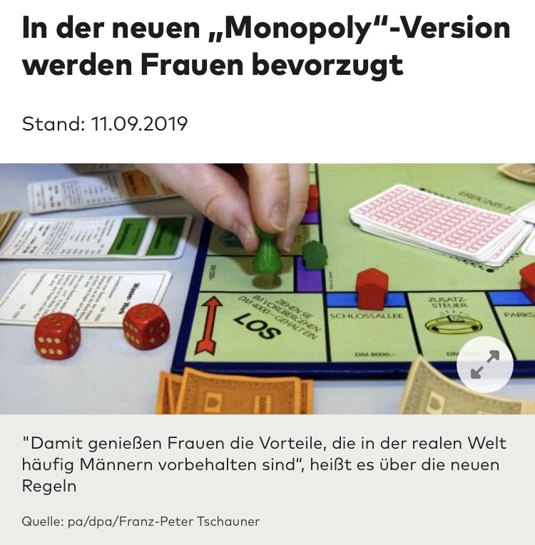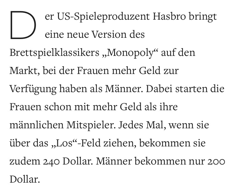„Auf dem neuen Spiel ist nicht der Immobilienmogul Mr. Monopoly mit seinem schwarzen Hut und weißem Schnurrbart zu sehen, sondern Ms. Monopoly, die Unternehmerinnen fördert. Die Spieler kaufen keine Grundstücke, sondern Erfindungen von Frauen wie WLAN und Solarheizungen. Das neue „Monopoly“-Spiel kommt ab Mitte September in den USA und auch in Deutschland auf den Markt.“