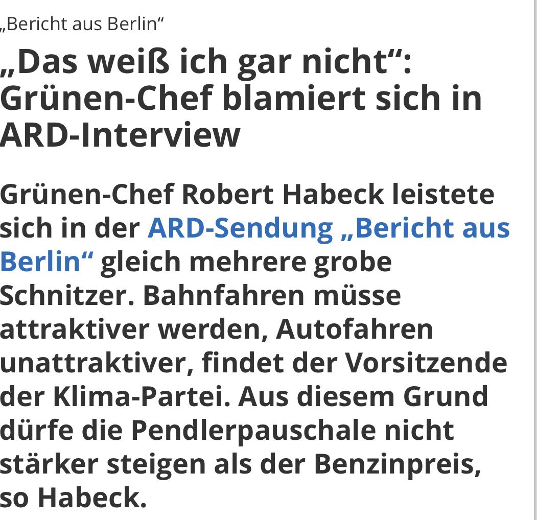 „Als Moderator Oliver Köhr Habeck daraufhin erklärte, dass die Pendlerpauschale auch für Bahnpendler gilt, redete sich der Top-Politiker um Kopf und Kragen. „Aber nicht, dann ist es ja nur die Erstattung des Bahntickets. Und die … oder wird die dann … das weiß ich gar nicht. Aber die entscheidende Frage ist, ob man dann mit dem Auto ein Anreiz hat zu fahren und das glaube ich wird durch diesen Mechanismus vorgegeben.“