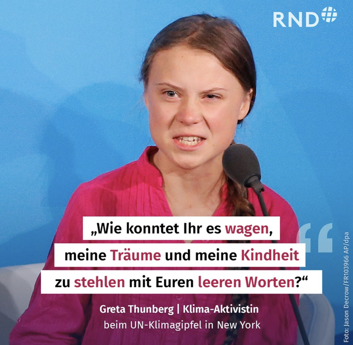 Greta Thunberg, das verhaltensauffällige 16 jährige Maskottchen der Klima-Rettung kommt auf der UN-Klimakonferenz genauso aggressiv daher! „Wie könnt ihr es wagen, zu uns, zur Jugend zu kommen, wenn ihr Probleme habt? Ihr habt mit euren leeren Worten meine Träume und meine Kindheit geklaut!“. Da sag ich: „Kindelein, deine Kindheit haben deine Eltern geklaut und deine Träume wahrscheinlich auch!“. Zu anderen Spekulationen lass ich mich nicht hinreissen. Egal. Anfangs fand ich sie ja noch ganz putzig, aber inzwischen geht mir die schwedische Göre auf die Nerven und bald auch ans Portmonee. Als unschöne Gallionsfigur der Migration. Mit Umweltschutz hat das alles nichts zu tun. Da ist Schluss mit putzig ähm lustig! Zu Merkel sag ich nichts.