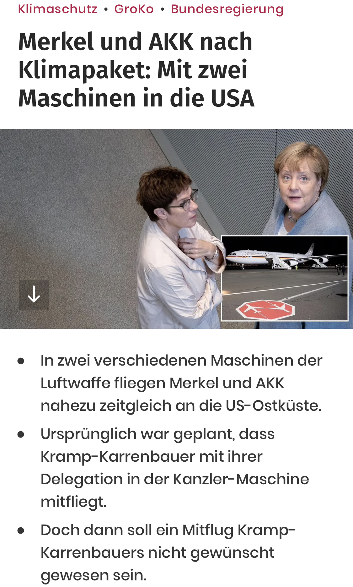 Die Verfahrensweise der Bundesregierung in Sachen Flugplanung ist trotz des neuen Klima-Pakets nicht strafbar. Bundeskanzlerette Angela Merkel (CDU), Aussenminimister Heiko Maas (SPD), Verteidigungsministrantin Annegret Kramp-Karrenbauer (CDU) und Umweltminimalistin Svenja Schulze (SPD) fliegen fast zeitgleich mit vier Flugzeugen nach Amerika. AKK’s Mitflug bei Merkel war nach Informationen aus dem Kanzleramt nicht erwünscht und Schulze fliegt Holzklasse im Linienflug. Hmm. Vielleicht hätte sie sich Zöpfe flechten sollen.