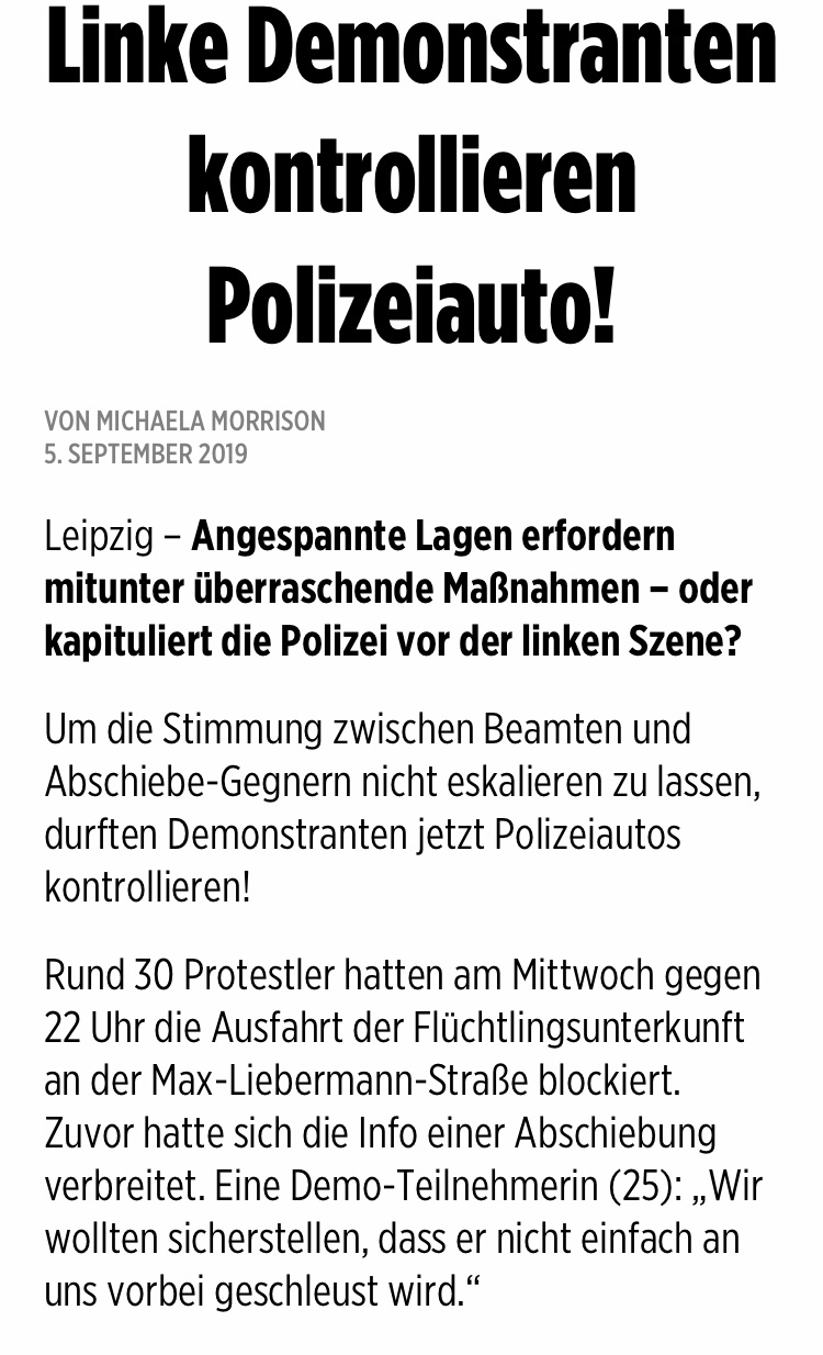 Laut BILD vom 5.9.2019 öffneten die Wachtmeister ihr Auto, um linksextremen Strassenterroristen zu zeigen, dass sie keinen illegalen Ausländer im Gepäck haben.