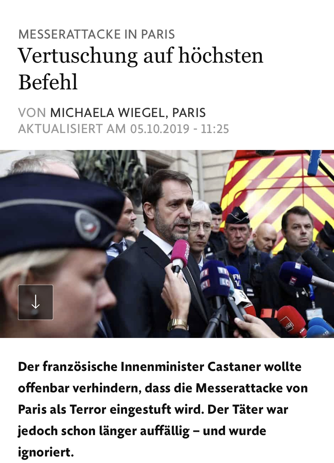 „Die tödliche Messerattacke auf vier Polizisten im Hochsicherheitsbereich der französischen Polizeizentrale in Paris wächst sich zum politischen Skandal aus. Immer mehr Details über die Radikalisierung des 45 Jahre alten Täters sickern durch – zum Unbill der Regierung, die 24 Stunden lang den Terrorismusverdacht leugnete. Doch seit Freitagabend ermittelt die zuständige Staatsanwaltschaft wegen Terrorverdachts. Das liegt nicht an der Entschlossenheit der Regierung, sondern an empörten Polizisten, die der Presse Informationen über den Hintergrund des Täters zugespielt haben.“