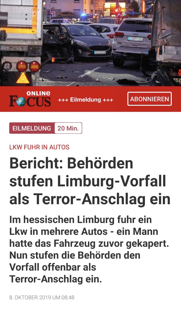 Kommen wir nun zu den vermeintlich Aufgewachten. Das Profilbild bei Facebook muss dieses Mal nicht ausgetauscht werden, da es glücklicherweise keine Todesopfer gab. Vielleicht werden diverse neue Facebookgruppen wie ‚Limburg sagt Nein‘ oder ‚Limburg gegen Terrorismus‘ gegründet, in denen man dieselben Bildchen und Artikel austauscht, wie auch sonst in den sozialen Netzwerken. Es wird eine Mahnwache abgehalten – vielleicht auch mehrere, da es ja nicht alle Orgas und Parteien schaffen, gemeinsam auf einem Platz zu stehen. Vielleicht gibt es sogar noch eine Demonstration und nach ein paar Monaten kann dann wieder Ruhe einkehren – es ist ja auch bald Weihnachten.