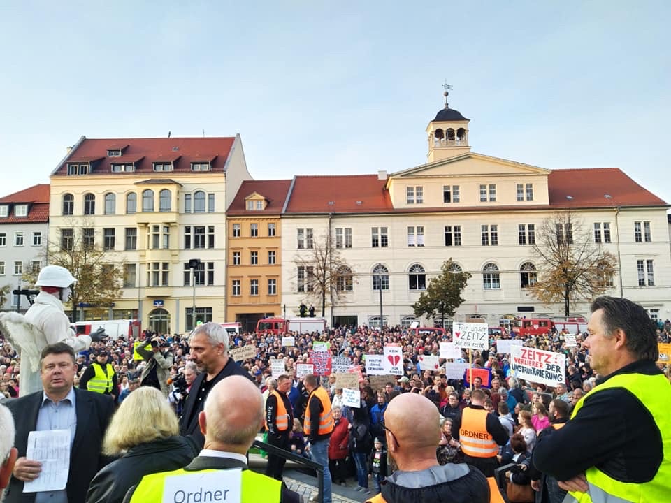 Auch am heutigen Tag berichteten wir aus der einstigen Stadt der Kinderwagen. Schon eine Stunde vor Kundgebungsbeginn hat man das Gefühl, dass die halbe Stadt auf den Beinen ist – Jung und Alt, verschiedene Vereine und auch die Feuerwehr in Mannschaftsstärke sind vertreten. Parteien und Organisationen spielen heute eine untergeordnete Rolle – es geht um den Standort Zeitz, und dafür sind die Anwohner der Stadt bereit zu kämpfen.