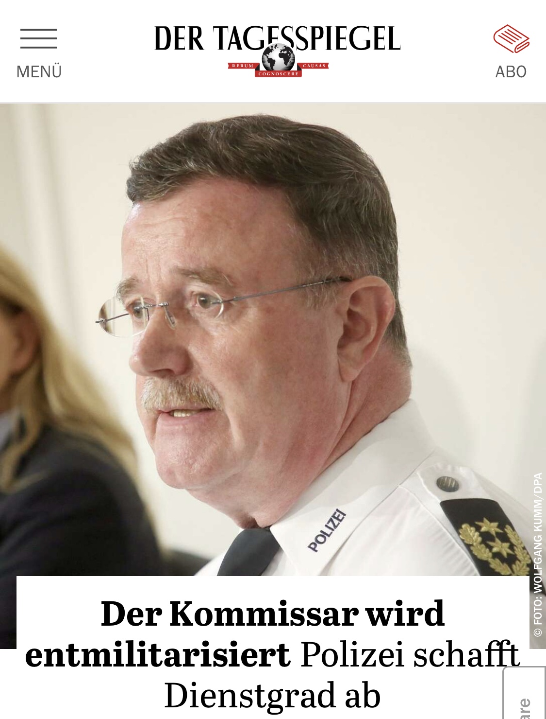 „Berlins Polizei wird 30 Jahre nach dem Mauerfall entmilitarisiert. Die Beamten sollen weg vom Soldaten im Inneren zum modernen Dienstleister. Gerade erst verkündete Innensenator Andreas Geisel (SPD), Barbara Slowik heißt in Zukunft nicht mehr „Der Polizeipräsident in Berlin“ – sondern die Behörde „Polizei Berlin“ mit Slowik als Präsidentin.“
