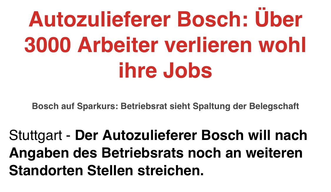 „Insgesamt gehe es nach aktuellem Stand um 3300 Stellen im Automobilbereich in den kommenden zwei Jahren, sagte Gesamtbetriebsratschef Hartwig Geisel am Mittwoch in Stuttgart.“