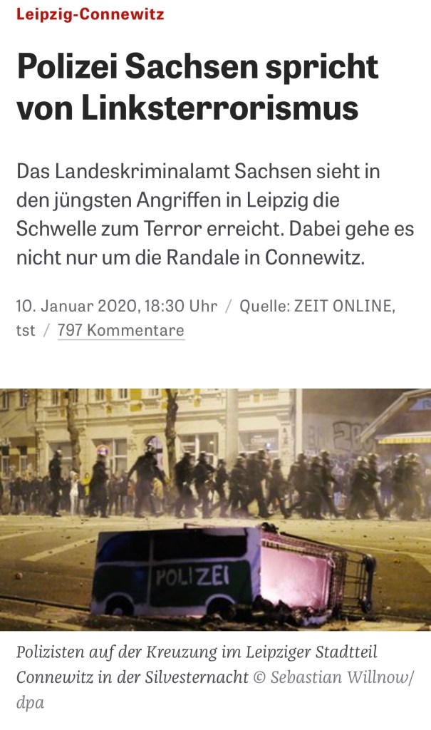 „Die Polizei Sachsen hat ihre Einschätzung zu den mutmaßlich von linken Gewalttätern verübten Anschlägen der vergangenen Monate aktualisiert. Wenige Tage nach der Randale im Leipziger Stadtteil Connewitz kommt die für Gefahrenabwehr zuständige Behörde zu dem Schluss, dass die Gewalttaten als Terrorismus bezeichnet werden können. Bisher sprachen sie von linksextremistischer Gewalt, vergangenes Jahr richtete das Landeskriminalamt eine eigene Sonderkommission dafür ein.“