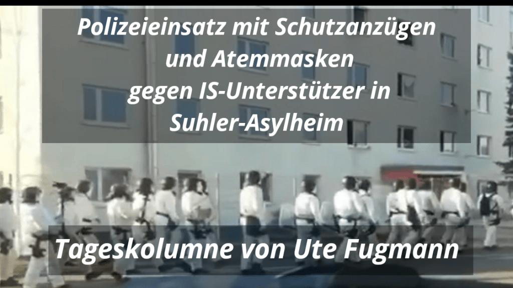 In Suhl war es nicht langweilig. Dort kämpfte die Polizei mit Sondereinsatzkommandos, Wasserwerfern, Panzern und Rettungswagen gegen den Islamischen Staat! Hä? Die Erstaufnahmestelle für sogenannte Flüchtlinge (EAE) in Suhl-Friedberg steht unter Quarantäne. Das passte einer Gruppe von bewohnenden Störern nicht. Eine Fahne des IS hatten sie schon geklöppelt und provokativ zur Schau gestellt. Das geht immer! Die wenigen Kinder ohne Bartwuchs wurden als Schutzschilde genommen. Auch wie immer. Die Polizei rückte ganz in weiss gegen 17.00 Uhr an. Die Atemmasken, Helme und Pistolenholster müssen noch farblich auf die Schutzanzüge abgestimmt werden. Sie trennte die seit Tagen auffällige Gruppe von den restlichen Bewohnern. Frank Haspel, Leiter der Suhler Polizei, erklärte den Einsatz damit, dass einige wenige all-inklusive-Gäste der Einrichtung ihren persönlichen Bewegungsdrang nicht den Gegebenheiten hätten anpassen wollen. Hmm. Ich sag lieber nix. Ob und wann die bewegungsfreudigen Astro-Physiker abgeschoben werden, steht vermutlich in den Sternen. Gaaanz hinten.