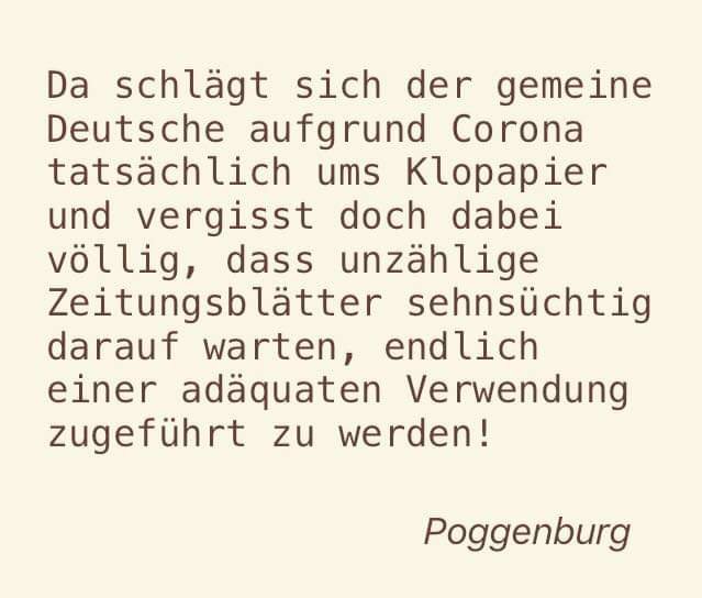 All dies sind Fragen, die einen wachen Verstand weit mehr umtreiben und zu gesunder Vorsicht animieren sollten, als der unerbittliche Kampf um die letzte Klopapierrolle oder irgendwelche übertriebenen (Hamster)käufe in unseren Großmärkten.