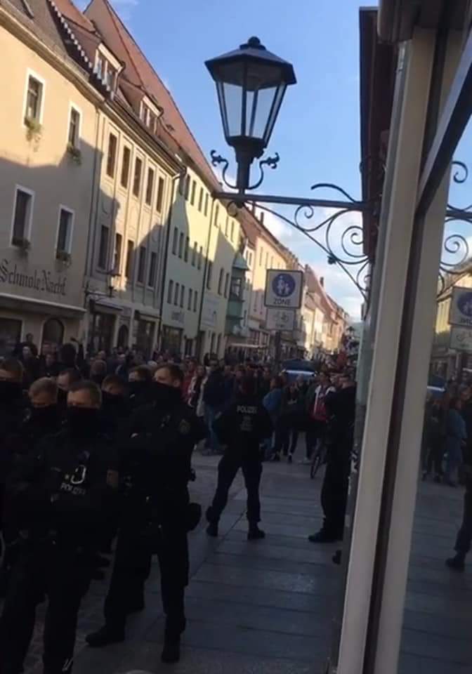 Von der Dohnaischen Strasse wollten wir rechts rum wieder zum Markt. Das war inzwischen eine Sackgasse für uns Spaziergänger. Vorwärts, wir müssen zurück! Doch auch da war Schluss. Komplett. Die Uniformierten riegelten alle Seiten ab. Unfassbar. Ich war mit meinen Freunden ziemlich weit hinten des Tross’ und somit noch ausserhalb der Falle.