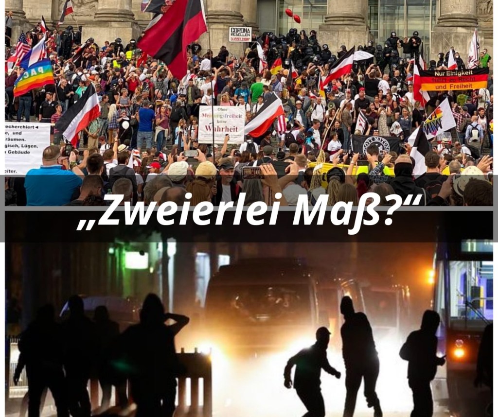 Im Gegensatz zur Belegung der Treppe des Reichstages durch friedliche Demonstranten am vorletzten Wochenende, melden sich zu den militanten Krawallen in Leipzig weder Kanzlerin Merkel noch Bundespräsident Steinmeier zu Wort. Diese schweren Ausschreitungen werden, im Gegensatz zum angeblichen „Sturm auf den Reichstag“, nicht von höchster Stelle als Angriff auf unsere Demokratie gescholten.