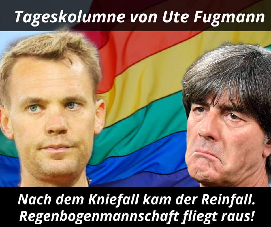 Ganz wund ähm bunt sind jetzt übrigens die Knie der „Regenbogen-Schaft“. Die Brexit-Buben haben die Moralisten aus Deutschland vom Platz gefegt. Eigentlich interessiert mich Fussball wie die Wasserstandsmeldungen, aber dass das heuchlerische Theater jetzt endlich ein Ende hat, halte ich für sehr begrüssenswert. Ende des nächsten Jahres können die Einhörner ja eventuell schon wieder in Katar auflaufen. Ich bin gespannt. Noch ein Spässle.