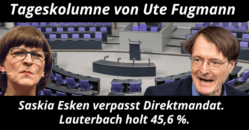 Die SPD-Vorsitzende Saskia Esken hat das Direkt-Mandat in ihrem Wahlkreis Calw verpasst. Hmm. Verpasst? Nein, sie unterlag dem CDU-Politiker Klaus Mack. Egal. Kennt kein Schwein. Beide. Egal. Das herbe Frauenzimmer kommt über die Liste in den Bundestag. Das zahlen wir Steuerzahler doch gern. Auch kein Spässle.