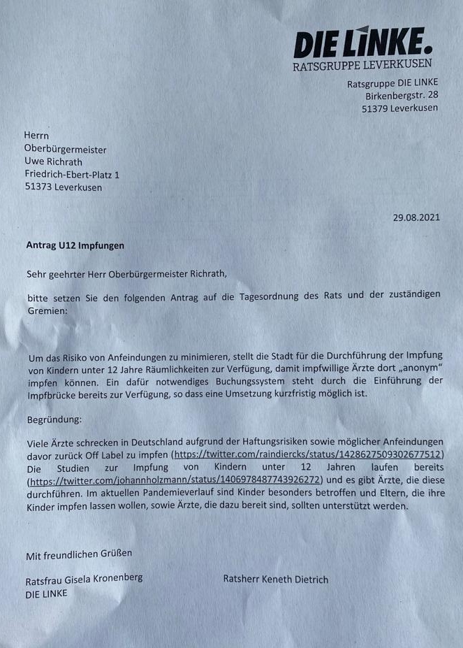 Während die Ständige Impfkommission (STIKO) erst nach massiven Druck aus der Politik eine Impfempfehlung für Kinder ausgesprochen hat, möchte die Leverkusener Linkspartei noch einen Schritt weitergehen. Sie beantragt nun, dass in Leverkusen Räumlichkeiten zur Verfügung gestellt werden, in denen Ärzte anonym impfen können.