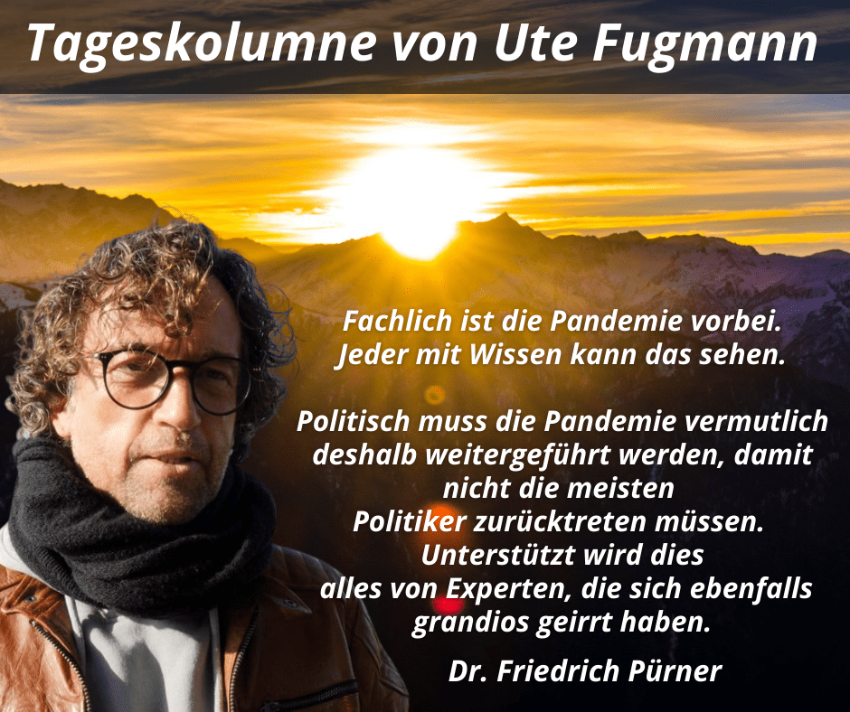 „Fachlich ist die Pandemie vorbei. Jeder mit Wissen kann das sehen. Politisch muss die Pandemie vermutlich deshalb weitergeführt werden, damit nicht die meisten Politiker zurücktreten müssen. Unterstützt wird dies alles von Experten, die sich ebenfalls geirrt haben“, sagte Dr. Friedrich Pürner, Facharzt für Öffentliches Gesundheitswesen und Epidemiologie. Hmm. Hilft uns das weiter? Ich glaube nicht. Ich glaube wir sehen uns spätestens Montag wieder auf den Strassen. Jeder an seinem Platz. Auch kein Spässle.