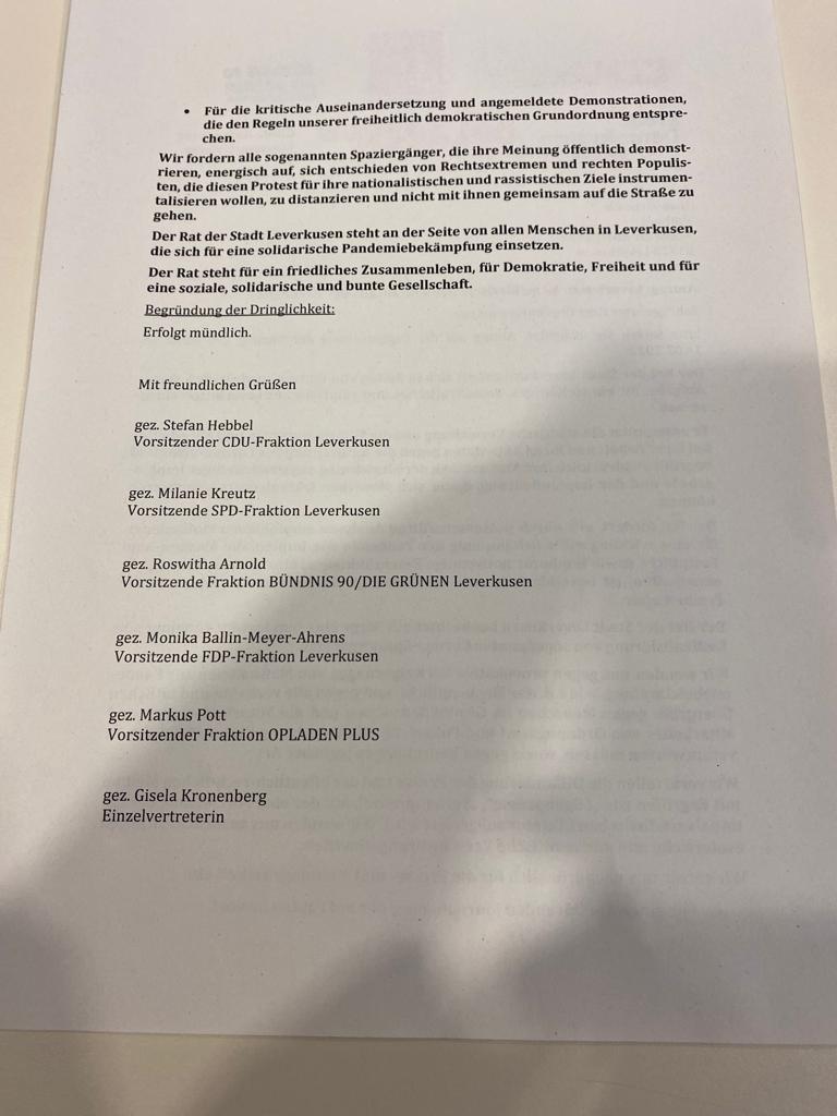 Bei der Ratssitzung die am heutigen Nachmittag stattfindendet, wird zumindest Ratsherr Markus Beisicht vom Aufbruch Leverkusen gegen diese Resolution Stellung beziehen. Ich bin stolz auf die vielen Menschen die auch in unserer Stadt für ihre Grund- und Freiheitsrechte friedlich auf die Straße gehen und werde sie auch in Zukunft parlamentarisch sowie außerparlamentarisch unterstützen, teilte uns der Leverkusener Rechtsanwalt mit.