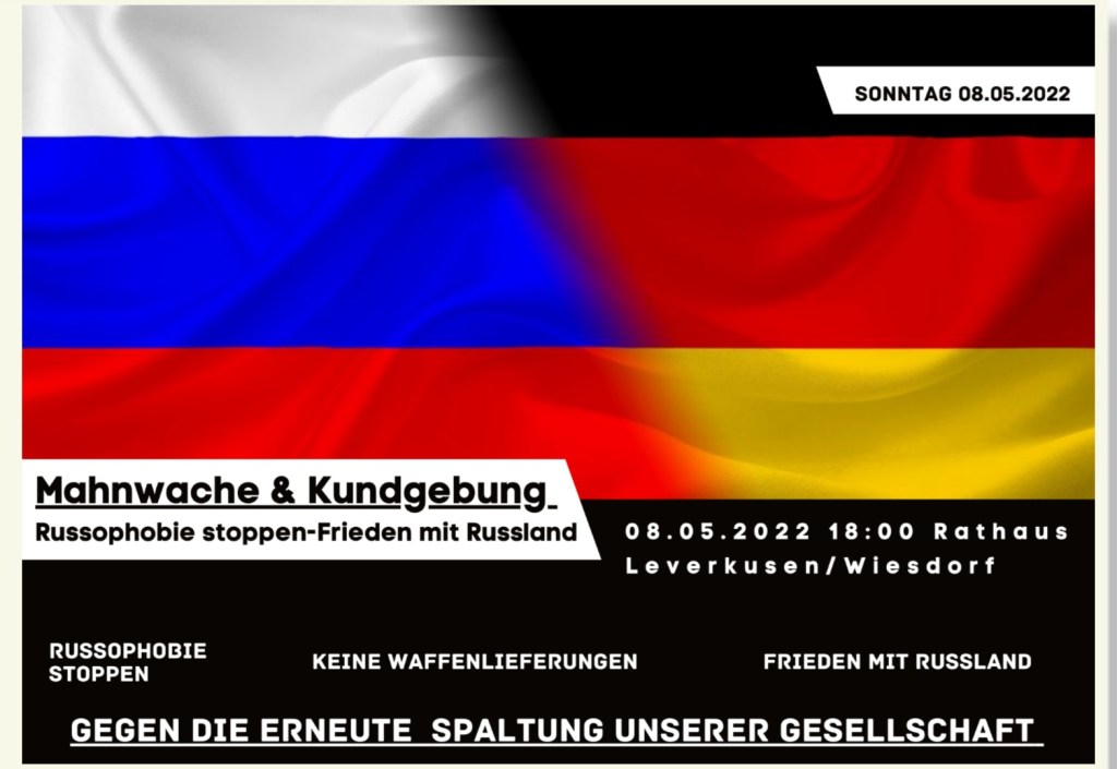 In der nächsten Woche berichten wir von der Veranstaltung Russophobie stoppen-Frieden mit Russland aus Leverkusen, zu der ebenfalls namenhafte Redner erwartet werden. Die Veranstaltung beginnt am 08.05 um 18:00 Uhr vor dem Rathaus in Leverkusen/Wiesdorf.