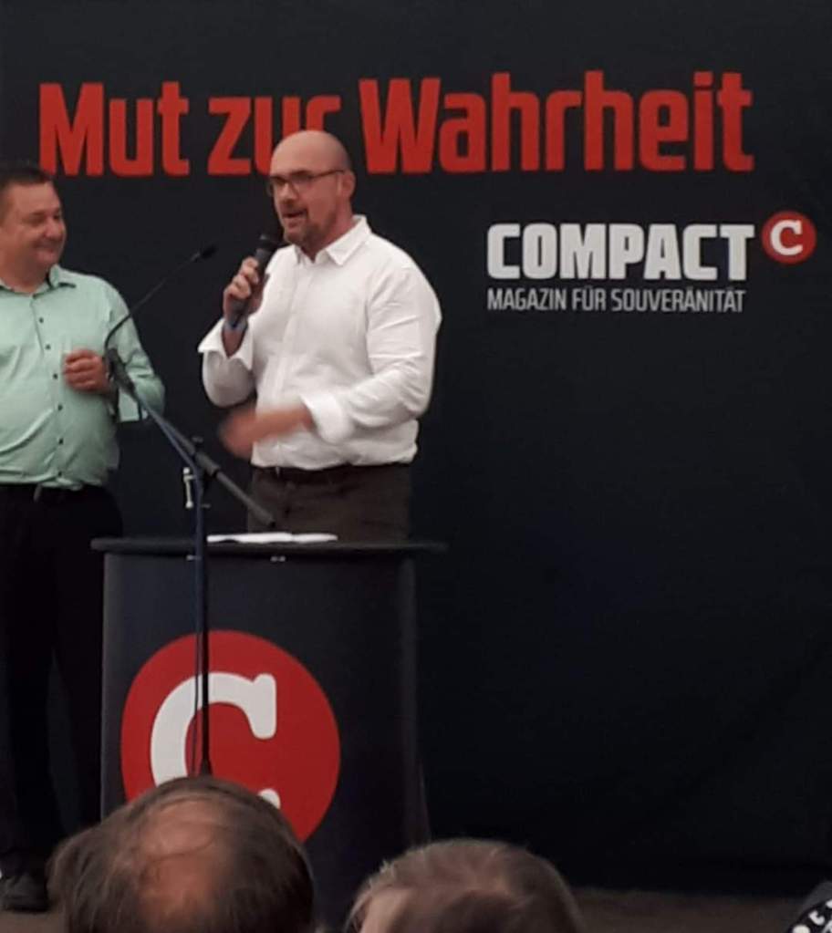 Eröffnet wurde die Veranstaltung durch den Compact-Chefredakteur Jürgen Elsässer, der nochmal betonte wie schwer es im „freisten Deutschland aller Zeiten“ ist noch geeignete Versammlungsräumlichkeiten zu finden.