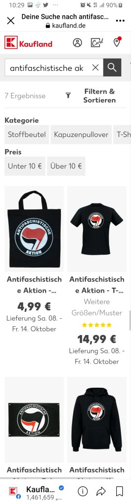 Die Handelskette Kaufland scheint zu derartigen Organisationen keine Berührungsängste zu haben. Zumindest über Ihr Onlineangebot waren Produkte mit dem Logo der Antifa käuflich zu erwerben und zwar bis zum heutigen Vormittag. Dementsprechende Meldungen machen seit einigen Stunden in den sozialen Netzwerken die Runde.