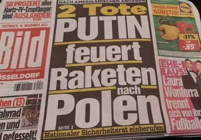 Unsere Pinocchio-Presse hat sich mal wieder selbst übertroffen! So schreibt die BILD-Zeitung ungeprüft und dreist , dass die russische Armee Polen bombardiert habe! Europa hielt die Luft an und es drohte eine direkte militärische Auseinandersetzung zwischen der NATO und Russland! Kanzler Scholz (SPD) sieht Deutschland ganz eng an der Seite ,, unseres“ NATO-Partners Polen und die ukrainische Administration versucht alles, um die gesamte NATO zu einer aktiven Kriegsteilnahme (3.Weltkrieg ) zu verleiten. Mittlerweile konnten die vorschnellen Anschuldigungen gegen Russland nicht mehr aufrechterhalten werden: Inzwischen steht fest, dass die Rakete, die in Polen eingeschlagen ist, wohl aus der Ukraine abgefeuert wurde! Trotzdem ganz schnell aus dem Ukraine-Konflikt der 3. Weltkrieg entstehen! Gerade wir Deutschen sollten aus der Geschichte gelernt haben und auf weitere Kriegspropaganda verzichten! Waffenlieferungen an die Ukraine machen einen Verhandlungsfrieden unmöglich! Die Diplomatie im Sinne von Willy Brandt und Gerhard Schröder ist jetzt gefragt! Zudem sollten wir unverzüglich aus der Sanktionsspirale aussteigen und endlich eigene Interessen verteidigen! Der Wirtschaftskrieg gegen unseren größten Energielieferanten Russland muss beendet werden! Es gibt viel zu tun!!!