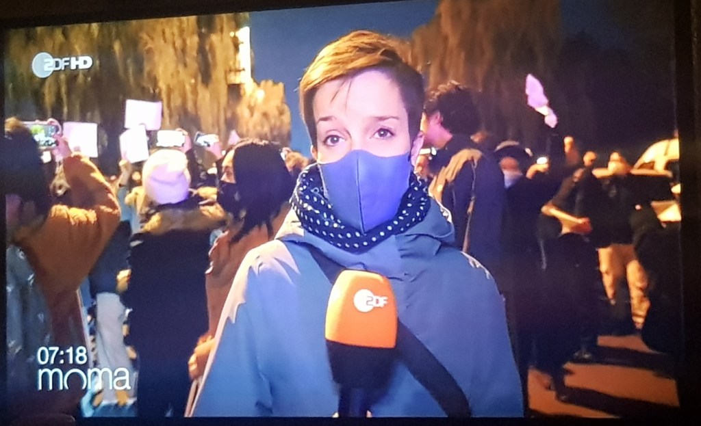 Bei der heutigen Ausgabe des ZDF-Morgenmagazins rieb sich der Fernsehzuschauer verwundert die Augen. So berichtete doch das ZDF tatsächlich wohlwollend über die Anti-Maßnahmen-Proteste in China. Man erwähnte sogar das die Protestler für ihre Freiheit kämpfen, die Menschen die dies in Deutschland machen sind allerdings laut Meinung der GEZ-Medien eine Gefahr für die Demokratie.
