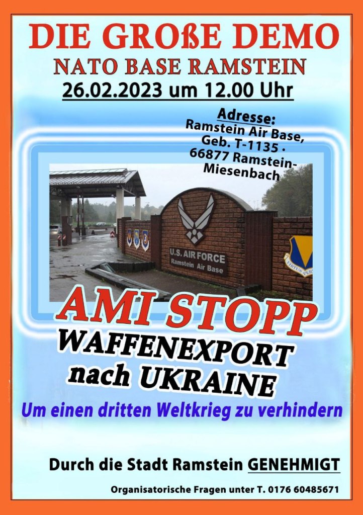 Am Sonntag den 26.02 demonstriert ein überparteiliches Bündnis vor der US-Airbase in Ramstein. Die US-Airbase wird von den Organisatoren der Veranstaltung als Ausgangspunkt für viele völkerrechtswidrige Angriffe der USA betrachtet. Zudem richtet sich der Protest gegen die noch immer andauernde US-Besatzung auf deutschen Boden und gegen die Lagerung von Atomwaffen in Deutschland.