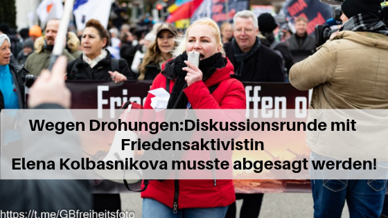 In der Gesprächsrunde sollte Elena Kolbasnikova über ihre Erfahrungen in der deutschen Friedensbewegung sprechen, unter anderem organisierte sie die Großdemonstration in Ramstein am 26.02.2023. Seit Mai fungiert sie als Vorsitzende, in der Querfront-Friedensbewegung Aufbruch Frieden-Souveränität-Gerechtigkeit. Hinzu sollte auch über ihre Hilfsaktionen für die Menschen im Donbass berichtet werden, Hilfsaktionen, die mittlerweile auch kriminalisiert werden.