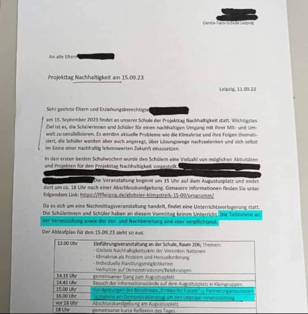 Es ist unfassbar, dass die Teilnahme an einer Kundgebung und einer politischen Demonstration mit ideologischem Hintergrund Bestandteile einer Schulveranstaltung sind, an der alle Schüler verpflichtend teilnehmen müssen. An diesem Vormittag fand kein Unterricht statt, was einen klaren Verstoß gegen die eigentliche Verpflichtung dieser Schule darstellt.