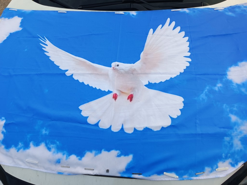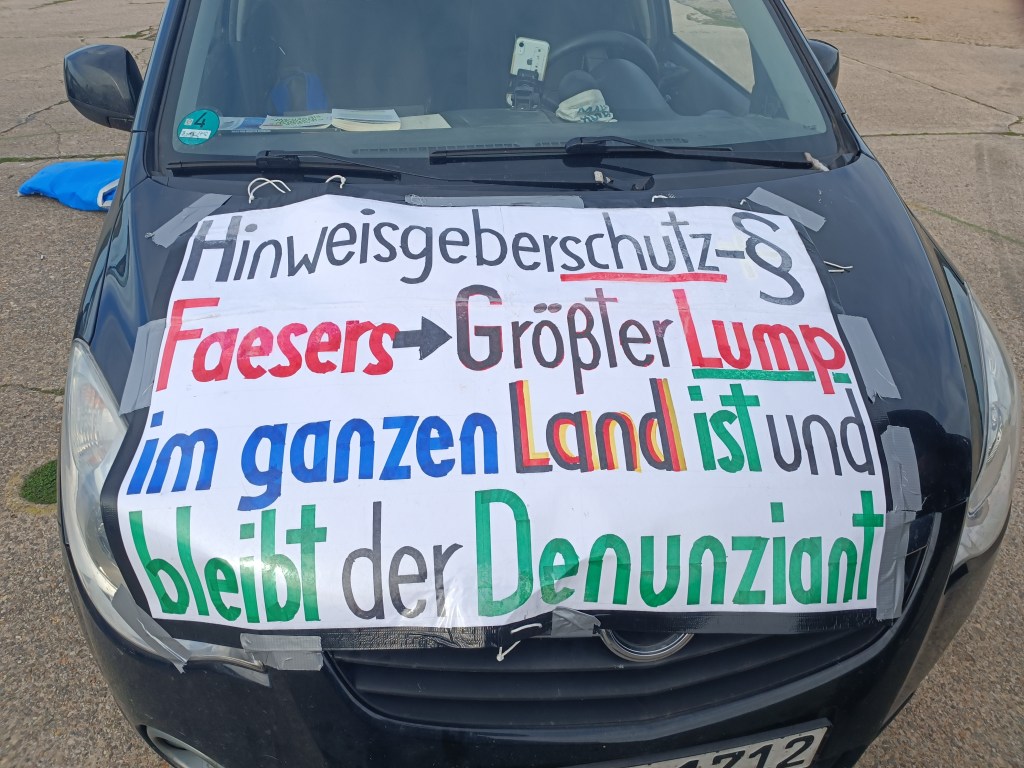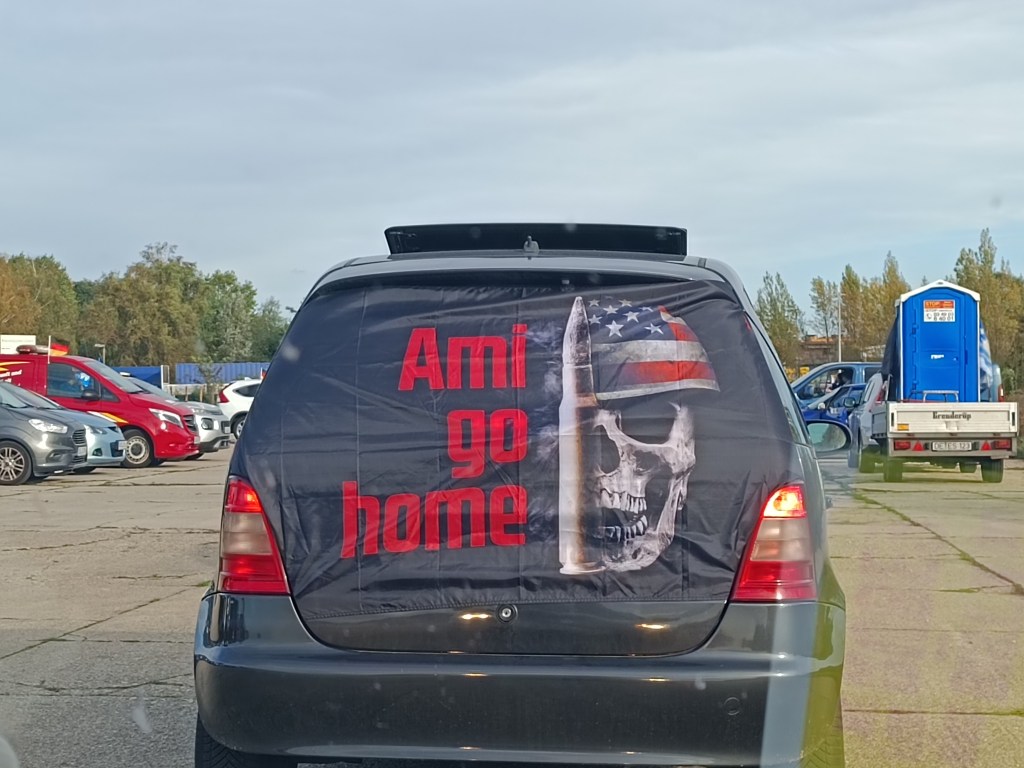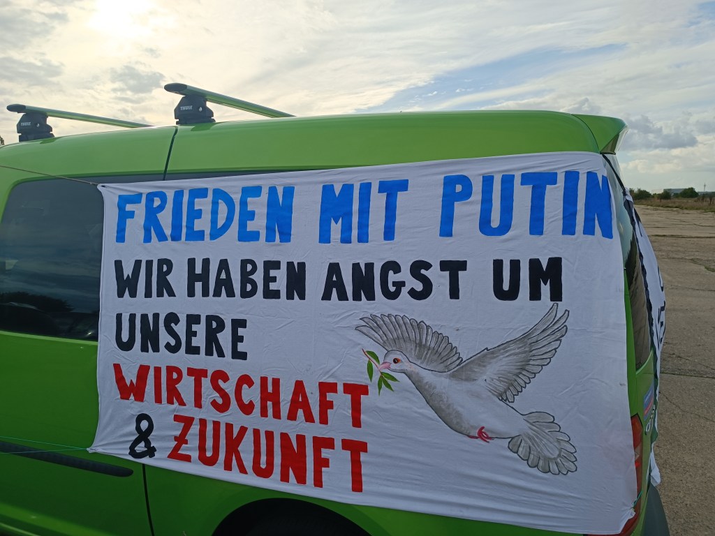 Am Startpunkt auf der alten Landebahn sammelten sich die Teilnehmer und bei selbst gebackenen Kuchen sowie frischen Kaffee entwickelten sich interessante Gespräche und der ein oder andere neue Kontakt konnte geknüpft werden. Die Autos wurden mit Plakaten dekoriert und schon ging es los. Viele Plakate befassten sich mit dem Thema Frieden.
