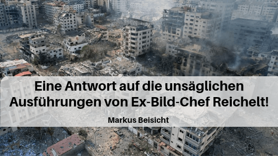 Ex-BILD Chef Reichelt vergleicht das völkerrechtswidrige Flächenbombardement in Gaza mit dem Flächenbombardement der anglo-amerikanischen Alliierten auf deutsche Städte im 2.Weltkrieg mit Hunderttausenden Toten Zivilisten und hält beides für moralisch absolut gerechtfertigt. Eine schlimmere Entgleisung ist kaum vorstellbar!! Nur durch die flächendeckende Bombardierung von Dresden, Hamburg, Berlin und anderer deutschen Großstädte haben man Deutschland brechen können! Das gleiche passiere jetzt in Gaza und sei natürlich gerechtfertigt! Vom Völkerrecht, dem Grundsatz der Verhältnismäßigkeit und von einer Empathie für unschuldige Frauen, Rentner, Kranke, Kinder und Babys scheint der vermeintlich konservative Publizist noch nie etwas gehört zu haben!