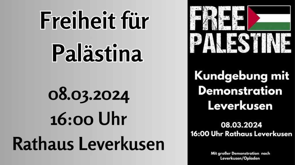 Als Aufbruch Frieden, Souveränität und Gerechtigkeit wollen wir am Freitag, dem 08.03.2024 in Leverkusen ein weiteres Zeichen gegen diese unmenschliche Politik setzen. Bei Verbrechen gegen die Menschlichkeit dürfen wir nicht schweigen. So findet am Freitag ab 16:00 Uhr vor dem Leverkusener Rathaus eine Kundgebung mit anschließender Demonstration statt. Die Veranstaltung steht unter dem Motto: Freiheit für Palästina. Die Veranstaltung wird gemeinsam durch Friedensaktivisten, Leverkusener Muslime, Aktivisten der palästinensischen Community und Mitglieder unserer Partei organisiert.