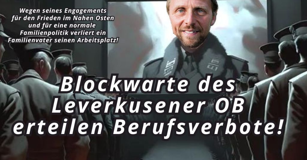 Das war dann zuviel für die Blockwarte der Intoleranz der Stadt Leverkusen! Der beliebte und zuverlässige Migrant mit arabischen Wurzeln erhielt Hausverbot, so dass der Arbeitgeber das langjährige Beschäftigungsverhältnis kündigen musste. Die wirtschaftliche Existenz des Familienvaters wurde brachial zerstört! Weltoffenheit, Vielfalt, Toleranz gegenüber Andersdenkenden und Migrantenfreundlichkeit gehören offenbar nicht mehr zur DNA der Stadt Leverkusen. Stattdessen mutiert die Stadt der Blockwarte der Intoleranz zur Meinungsdiktatur.