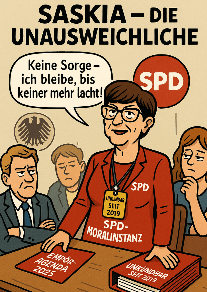 Esken ist die wahre Überlebenskünstlerin der SPD, aber nicht auf die Art, wie man es sich wünschen würde. In einer Partei, die verzweifelt versucht, sich aus der Bedeutungslosigkeit zu befreien, steht sie immer noch fest und unerschütterlich. Sie ist wie der seltsame Verwandte, der bei jeder Feier auftaucht, obwohl niemand ihn wirklich eingeladen hat – aber was soll man machen? Ignorieren geht nicht. Und anstatt in der Bedeutungslosigkeit zu verschwinden, bleibt sie einfach da und spielt das Spiel weiter, als wäre sie die zentrale Figur der politischen Bühne.