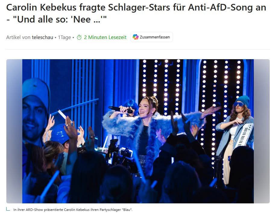 „Wir waren schon vor euch blau – und wir werden’s immer sein“ – so lautet die musikalische Botschaft der 44-jährigen Show-Gastgeberin. „Blau ist eine schöne Farbe“, sagt sie in ihrer Anmoderation. „Und die geben wir nicht her. Wir geben gar nix her – wir wehren uns gegen die rechtsextreme AfD.“