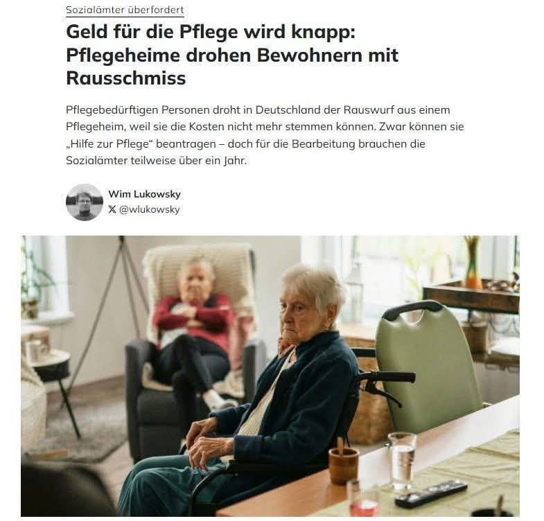 Nachdem im öffentlichen TV alte Menschen als Nazisäue und Umweltsünder bezeichnet und besungen wurden, ist es doch gesichert rechtsextrem, wenn man sich um diese alten Menschen kümmert. Nachdem Merz verkündete, wir sollen länger arbeiten, bleibt keine Zeit für die Alten. Die Zerstörung der Familie ist gewollt seit Jahren, Großfamilie gibt es nicht mehr, zumindest unter der eigenen Bevölkerung. Arbeiten sollst du, bist du die Radieschen von unten siehst, aber wenn du alt bist, bist du nichts mehr wert, kann weg, nutzlose Esser, wer soll das bezahlen? Geht man so mit Menschen um, die den Krieg erlebt haben, Entbehrungen erlitten und mit eigener Kraft das Land wieder aufgebaut haben? NEIN!