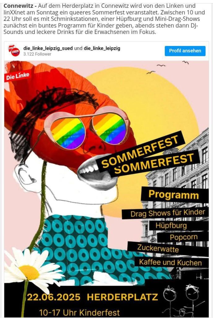Die Linke in Zusammenarbeit mit dem als Antifa bekannten linXXnet veranstalten am Sonntag, den 22. 06.2025 in Leipzig ein Sommerfest für Kinder im Zeichen von „Queer“ unterm Regenbogen.