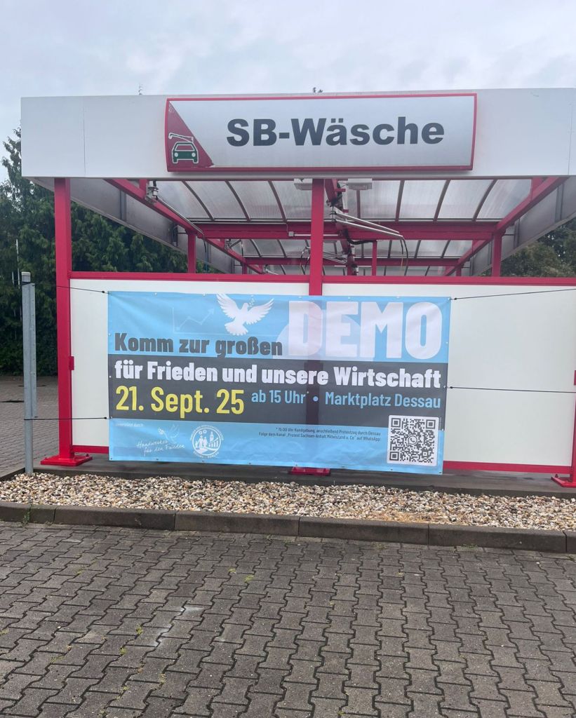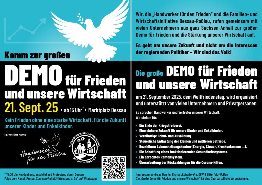 Dessau-Roßlau. – Am 21. September soll der Dessauer Marktplatz zum Platz einer groß angelegten Wirtschafts- und Friedensdemonstration werden. Veranstaltet wird die Kundgebung von der Familien- und Wirtschaftsinitiative Dessau-Roßlau, die bereits in der Vergangenheit durch Aktionen wie Autokorsos, Demonstrationen und das sogenannte Brückenleuchten auf sich aufmerksam gemacht hat. Als Schirmherr fungieren die Handwerker für den Frieden, die auch in die Organisation mit eingebunden sind. Die Handwerker für den Frieden sind bereits seit mehreren Jahren im Bereich Friedenspolitik aktiv.