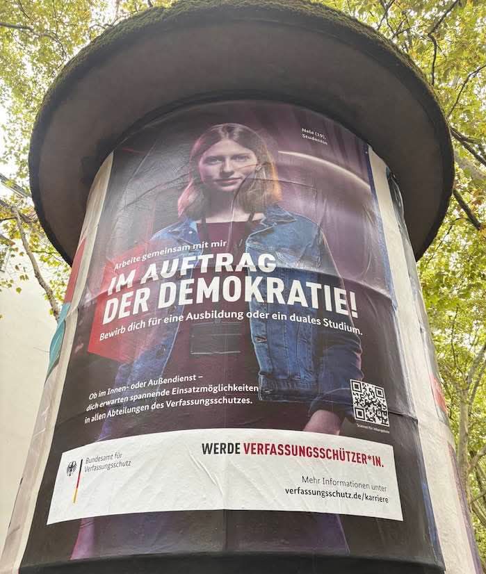 In Köln und in vielen weiteren Städten wird die gesamte Innenstadt mit solchen Werbekampagnen des sogenannten Verfassungsschutz beglückt! Würde diese Behörde ihre Arbeit ernst nehmen, dann wäre die Bundesregierung längst ein Beobachtungsobjekt.