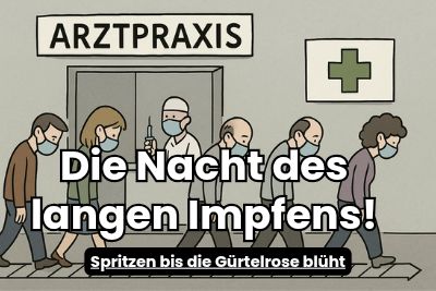 In der sogenannten „Langen Nacht des Impfens“ (erinnert mich irgendwie an die Nacht der langen Messer) tut man so, als sei nichts gewesen. Ärzte, Mediziner oder Apotheker, die sich daran beteiligen, können meiner Meinung nach weder Moral noch ein Gewissen haben. Vielleicht kann man die Spritzwilligen nebenbei gleich noch mustern. Schließlich möchte die BRD Kanonenfutter für NATO-Kriege und ihr Kesseltreiben gegen die Russische Föderation. Aber Thrombosen, Gürtelrosen oder andere Nebenwirkungen machen sich bestimmt nicht gut in einem eventuellen Kampfeinsatz.